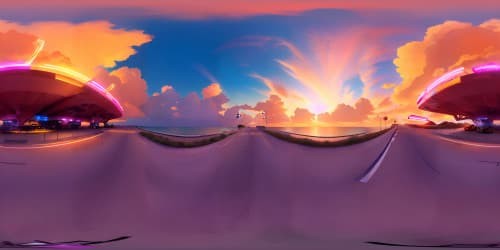 Cars and motorcycles on the seaside highway (orange and pink sky)