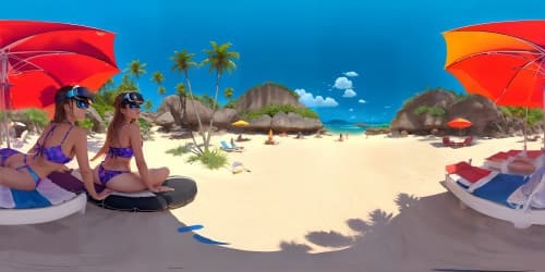 This image captures women enjoying a day at the beach, all clad in colorful swimsuits, creating a vibrant and cheerful scene.