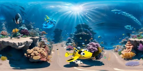 The panorama image depicts the serene and mysterious underwater world of the deep sea ocean.