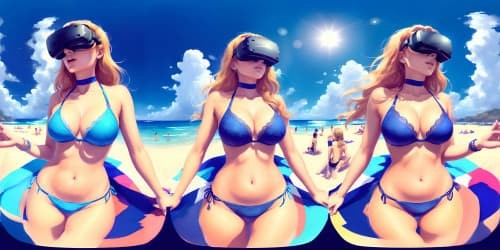 At the beach, women in swimsuits enjoy the sun and ocean, creating a vibrant and relaxing scene.