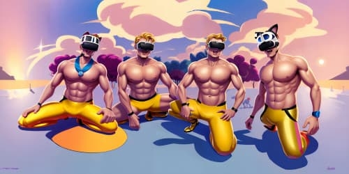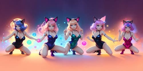 Digital Paintingfive princesses_wearing pink leotards_one woman has blue eyes_two of the women are blonde_they are squatting_spread_arms above their heads_close up of armpit_ cat ears