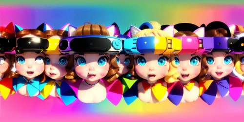 Cartoonfive princesses_wearing pink leotards_one woman has blue eyes_two of the women are blonde_they are squatting_spread_arms above their heads_close up of armpit_ cat ears