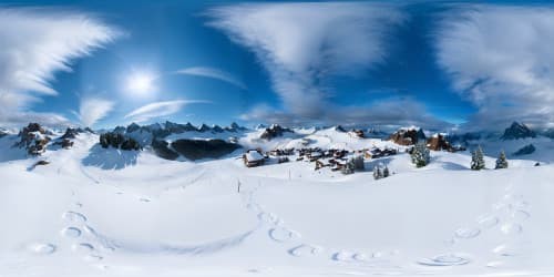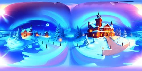 VR360: masterpiece quality, hyperrealistic textures. Winter wonderland theme, twinkling Christmas lights, snow-tipped pines. Style: ultra-high resolution, digital painting.