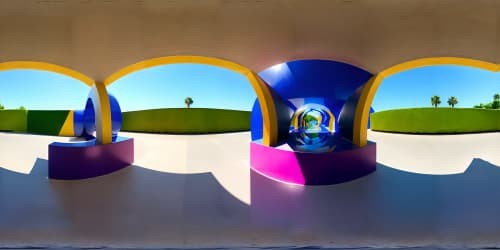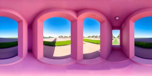 In this panorama image, five blondes wearing pink leotards are deep squatting. Their striking blue eyes make strong eye contact.