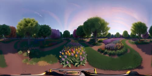 VR360 masterpiece, ultra high-res. Hillside vantage, panorama of vibrant flower field, red-blue-purple-orange-pink-yellow. Horizon boasting setting sun, VR360 skyview.