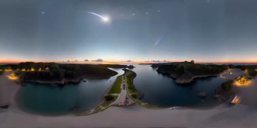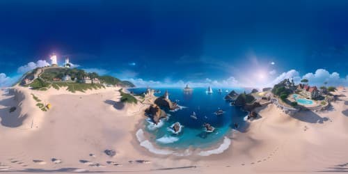 In the dark depths of the night, a majestic lighthouse stands proudly on a distant shore. Situated amidst the vastness of the deep blue sea, its beacon cuts through the darkness, guiding lost souls with unwavering certainty. The crashing waves, like symphonies of power, relentlessly clash against the rugged rocks, causing a mesmerizing spectacle. Above, a clear sky unveils its breathtaking array of stars, while shooting stars streak across the horizon, leaving trails of magic in their wake. From a bird's-eye view, this enchanting scene appears like a painting come to life, beckoning one to find solace and serenity in the infinite beauty of the sea and the heavens above.