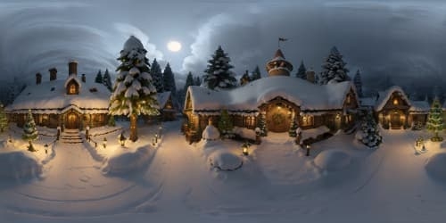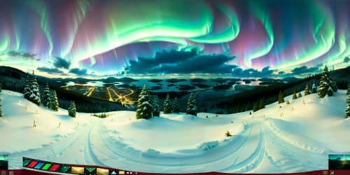 VR360 ultra-high res, snow-covered valley from hillside vantage, evergreens cloaked with snow, twinkling Christmas lights, night-time horizon ignited by northern lights, combined with a touch of digital painting.