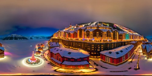 In this panorama image, a snow-covered Christmas town twinkles with colored lights amidst pine trees, creating a magical winter atmosphere.