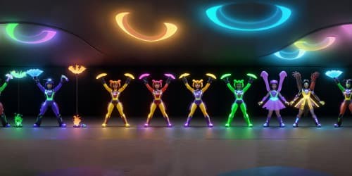 Fantasyfive evil female angels wearing tiny black leotards with red trim_they have golden wings_the women have gold halos over their heads_one woman has dreadlocks_two of the women are african american_they are flying_one woman is carrying a flaming green hammer.