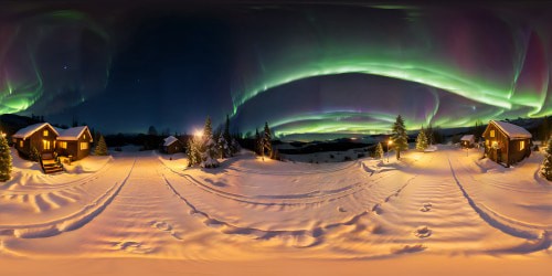 Digital PaintingVR360 ultra-high res, snow-covered valley from hillside vantage, evergreens cloaked with snow, twinkling Christmas lights, night-time horizon ignited by northern lights, combined with a touch of digital painting.