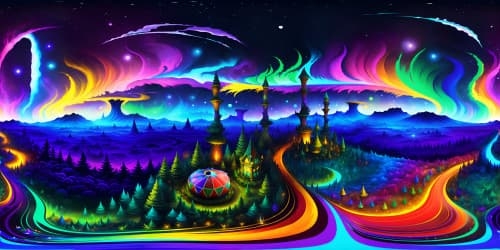 In this psychedelic illustration, vibrant colors and abstract shapes create a mesmerizing scene that is both surreal and captivating.