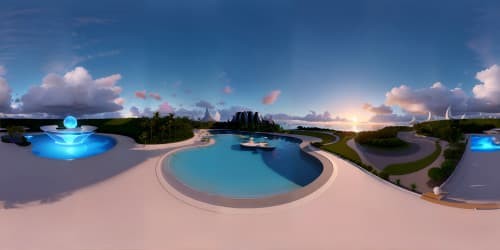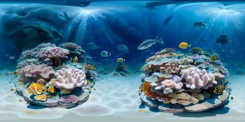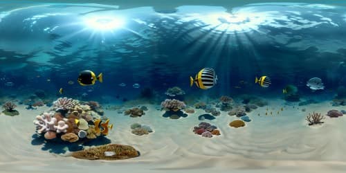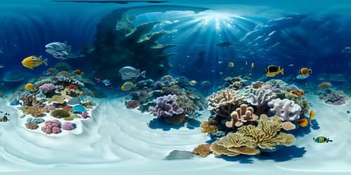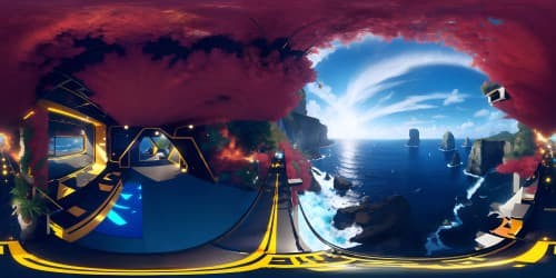 Masterpiece quality, ultra-high resolution, azure sea view, VR360 panorama. Glimmers on sea surface, distant horizon, pastel hues sky. Dynamic light play, dreamlike, sublime. Subtle stylization, radiant Surrealist touches.