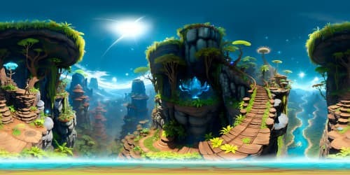Avatar-inspired, Pandora jungle, bioluminescent flora, floating mountains, cascade waterfalls. VR360 masterpiece, ultra high-res, top-tier quality. Ethereal creatures, mystical ambiances. VR360 artistry, digital painting finesse.