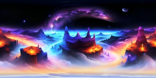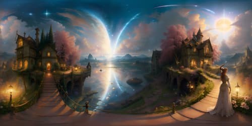 Exceptionally high-res VR360 scene, ultra-detailed masterpiece. Shimmering celestial bodies, magnificence expanded in VR360 panorama. Dazzling nebulae exuding surreal hues, cosmic dust clouds in hyperrealistic textures. Painting-style, impressionistic brush strokes, emphasis on light and color interplay.