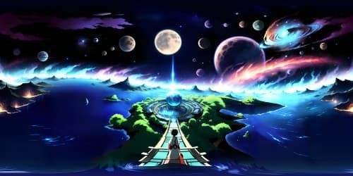 VR360 scene, cosmic panorama, ultra-high resolution, celestial bodies, glow, sparkle. Beautiful alien females, anime style, vibrant, surreal. Masterpiece, intricate details, luminescent color scheme.
