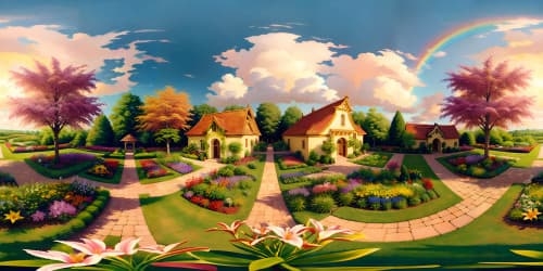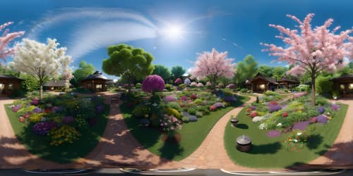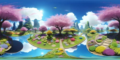 Dutch MastersUltra-HD, floral masterpiece tropical, elevated view, skyview of a VR360 botanical garden, vibrant, rainbow-hued array of blossoms. Minimalist foreground, emphasis on grand, sprawling flora vista. Style: Realism with a whimsical touch, color intensity heightened for VR360 allure.