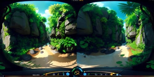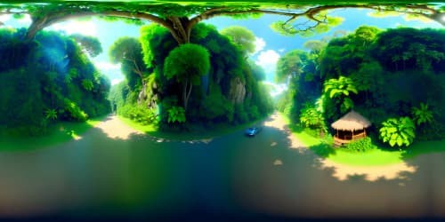 Masterpiece quality, ultra-high resolution, VR360 view, tropical rainforest skyline, lush canopy, Amazon River mirrored in sky, VR360 tropical palette, vibrant hues of green and blue