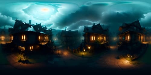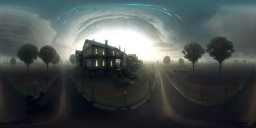 Digital PaintingUltra high-resolution VR360, masterpiece of Silent Hill inspired ambiance, misty landscapes, thick fog, decaying structures, ominous night sky overrun by dark clouds. Style: photo-realistic with a touch of horror, eerie glow from the moon.