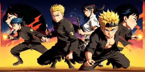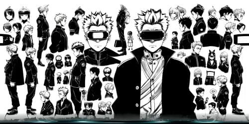 In this Manga style panoramic image, Gojo Satoru from Jujutse Kaisen stands alone, donning silver hair and captivating crystal blue eyes. He is dressed entirely in black.