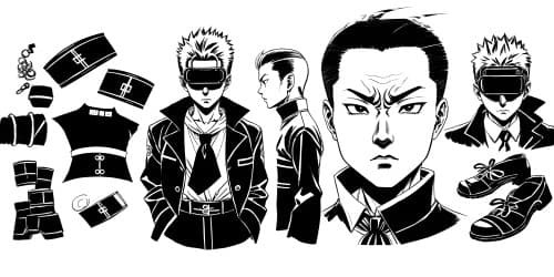 MangaJujutse Kaisen. only Gojo Satoru in the scene. in silver hair and crystal blue eyes. his clothes are all black