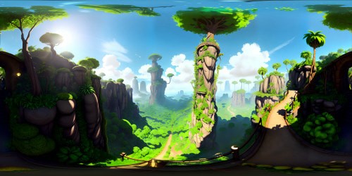 Premium quality, masterful VR360 creation, ultra high-res display. Lush, verdant VR360 jungle panorama. Canopy of leafy fronds, colossal trees, exotic, vibrant foliage. Intricate, Pixar-style.