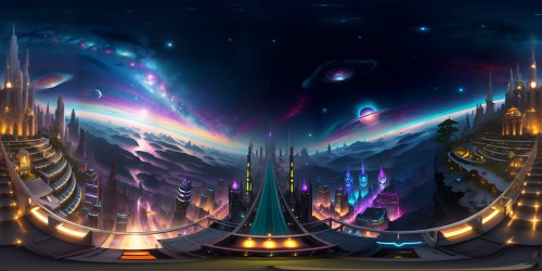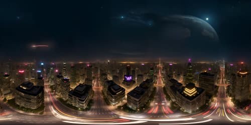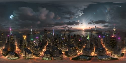 Masterpiece quality, ultra-high res, VR360 view of NYC skyline at night, glittering skyscrapers, moonlit Hudson River, star-studded velvet sky. Style: realistic digital painting, meticulous detailing, refined neon glow effects.