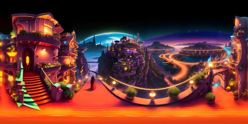 VR360 view, Cancun Mexico skyline, night, neon reflections, star-studded sky. Masterpiece-style, ultra-high-resolution, best quality. Emphasis on depth, shadows, and light contrasts. Distinctive Pixaresque style, bold colors.