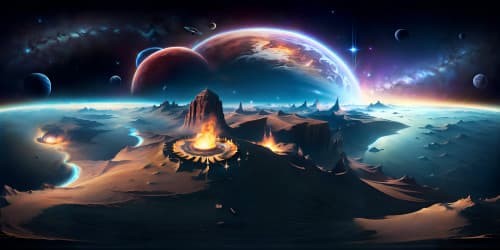 VR360 masterpiece, ultra-high-res, celestial spectacle. Planets nearby, floating in space. Stardust trails, luminous, opalescent planets. VR360 view, cosmic ballet, serene, infinite. Pixar-style artwork, vibrant hues, ethereal glow, captivating depth.