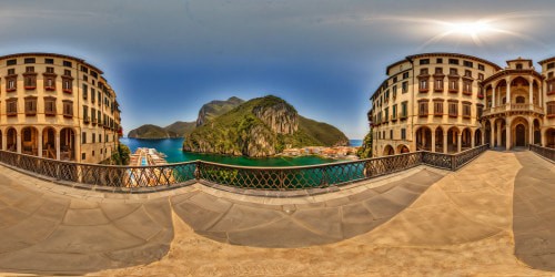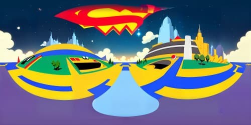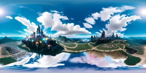 RealismMasterpiece level, VR360 backdrop, comic-inspired style, superior clarity. Crystal-imbued heavens, billowing clouds in cartoonish allure. Remote, exaggerated metropolis silhouette. Enveloping VR360 panorama, alive with color, minimalistic forepart.