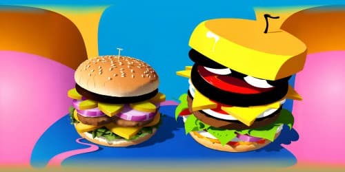 In this cartoon-style panoramic image, SpongeBob can be seen holding a burger with a cheerful expression.