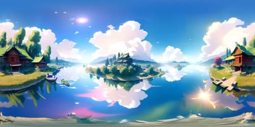 Masterpiece, VR360 view, ultra-high resolution, stylized in Chinese ink. Misty clouds, solitary boat drifting, tranquil river. VR360 perspective, traditional, classical ambiance.