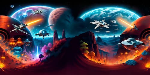 In this panoramic image, the scene portrays a spectacular battle from the world of "Star Wars," filled with intense action and intergalactic warfare.