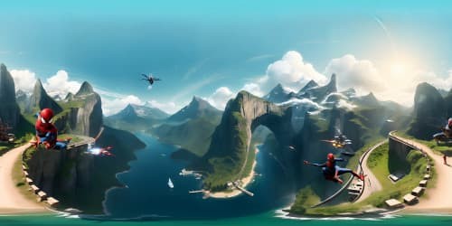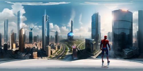 The scene captures Spiderman in action, swinging through the city with his iconic web-slinging abilities.
