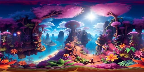 Avatar-style, Pandora jungle VR360 panorama, fluorescent bio-luminescent foliage, exotic alien flora, fantasy art, ultra HD, awe-inspiring terrestrial creatures
