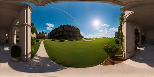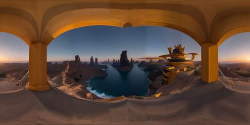 VR360 panorama, blazing sun mastery, fiery horizon spectacle, ultra-high-resolution. Cobblestone streets, sizzling, shimmering heat. Ice cream cones, drippy puddles, stark contrasts. White ice cream swirls, luscious, enticing texture, chilling counter to simmering ambience. Picasso-style, abstract yet intriguing VR360 artistry. Surreal, immersive, vivid melting