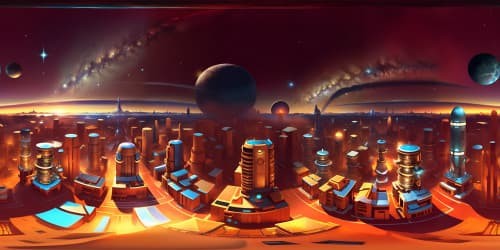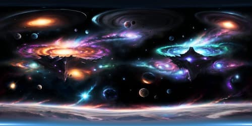 masterpiece quality VR360, ultra-high resolution, expansive cosmic panorama, spiral galaxies, nebulae clusters, celestial bodies, star-studded skyline. Style: hyperrealistic, intricate details, radiant hues, dramatic contrasts.