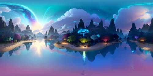 VR360 view, Pandora from Avatar, bioluminescent flora, floating mountains. Extraordinary world in ultra-high resolution, masterpiece art style. VR360 immersive experience, vivid colors, harmonious ecosystem, surreal and fantasy-like.