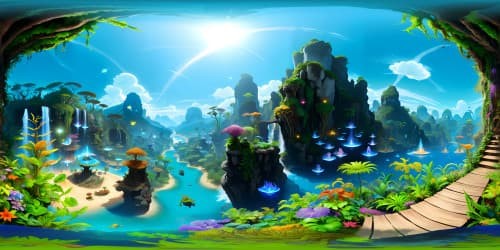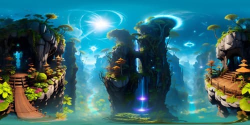 Avatar-inspired, Pandora's lush jungle, exotic flora, bioluminescent plants, floating mountains, iridescent waterfalls, mastery artistry, ultra-high resolution, VR360 verdant panorama, magnificent bio-luminescence, VR360 fantasy realism.